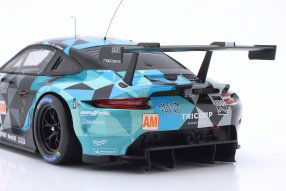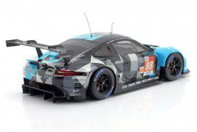 Ixo has released a model in scale 1:18 of the Porsche 911 RSR-19 fielded by Dempsey-Proton Racing and driven by Dominique Bastien. The model features the typical Proton livery of gray with light blue accents and accurately reflects the original.